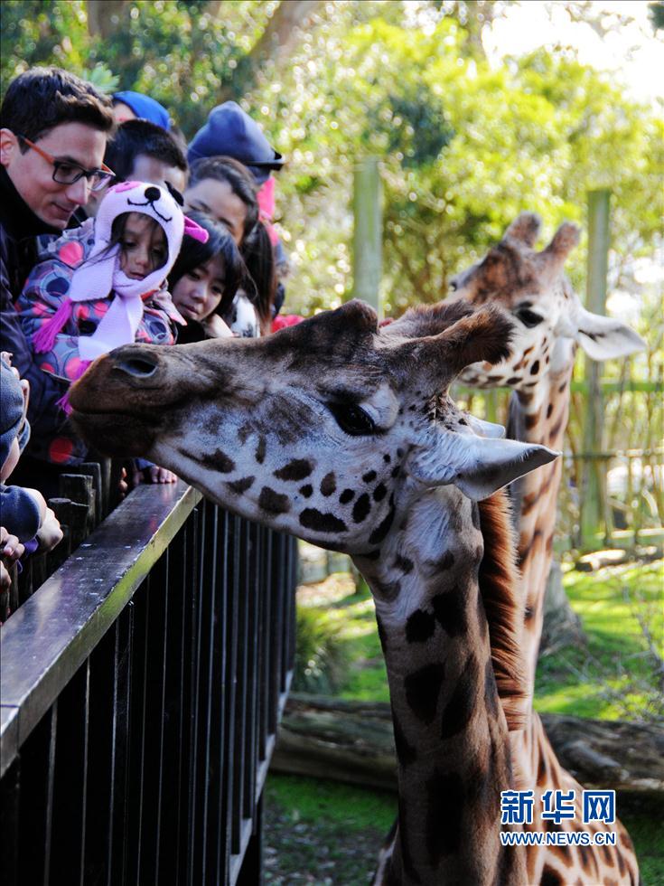 Local people play with giraffes at a zoo in Wellington, New Zealand on May 25, 2014. (Xu Liang/Xinhua News Agency)