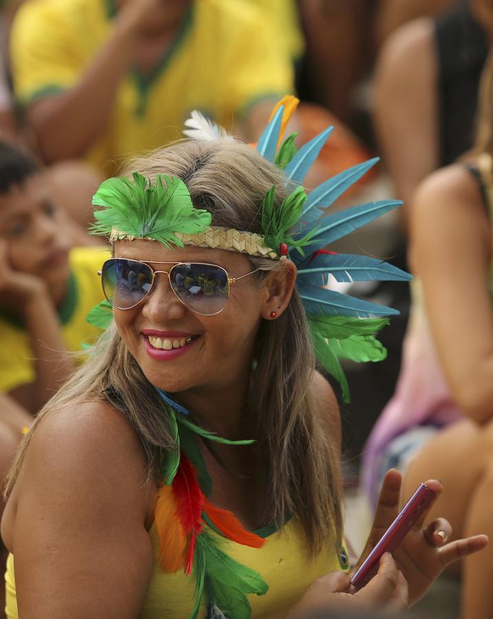 | A Brazilian woman smiles as she watches her team play against Croatia during their 2014 World Cup opening match at a FIFA event in Manaus, June 12, 2014. [Photo/Agencies] |