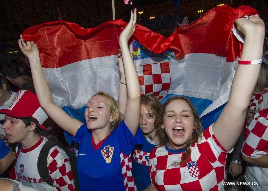 Croatian soccer fans cheer while watching the televised match between Croatia and Brazil, in Zagreb, Croatia, June 12, 2014. Thousands of fans on Thursday watched the FIFA World Cup opening match on a big screen at Zagreb's central square. (Xinhua/Miso Lisanin)