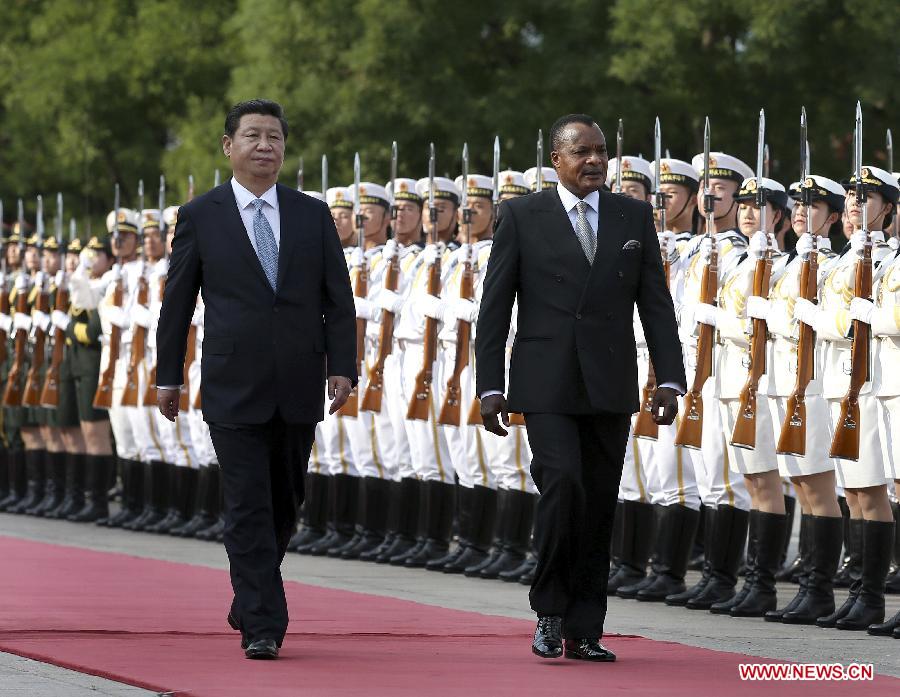 | Chinese President Xi Jinping (L) holds a welcoming ceremony for Denis Sassou Nguesso, president of the Republic of Congo, before their talks in Beijing, capital of China, June 12, 2014. (Xinhua/Pang Xinglei) |