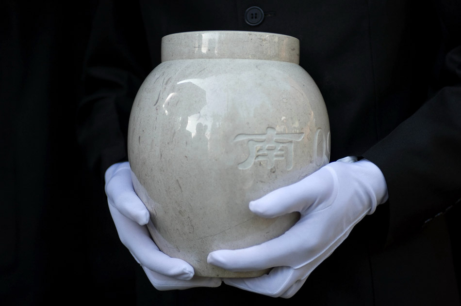 With the funeral urns in their hands, people dressed in black Chinese tunic suit protect the souls of the deceased soldiers at Guoshang Cemetery on June 12. (Xinhua/Hu Chao)