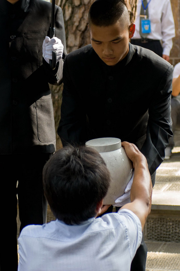 People dressed in black Chinese tunic suit hand over the funeral urns to the staff at the ceremony of reburial on June 12. (Xinhua/Hu Chao)