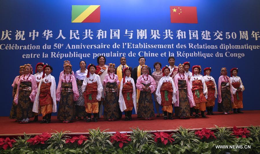| Zhang Dejiang , chairman of China's National People's Congress (NPC) Standing Committee, and Denis Sassou Nguesso, president of the Republic of Congo, pose for a group photo with students from an elementary school funded by the Republic of Congo after a 7.1-magnitude earthquake struck Yushu, a Tibetan prefecture in west China in April 2010, in Beijing, capital of China, June 13, 2014. The celebration of the 50th anniversary of the establishment of diplomatic relations between China and the Republic of Congo was held here on Friday. (Xinhua/Pang Xinglei) |
