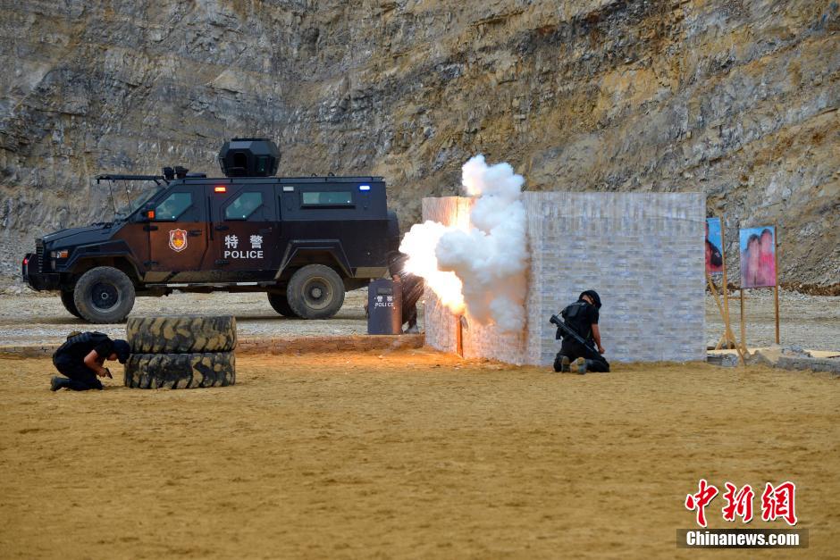 Police in Qiannan Prefecture, southwest China's Guizhou Province, holds a drill to practice anti-terrorism, emergency response and other skills to improve their ability in emergency disposal on June 12, 2014. (Chinanews/Wu Qingyuan)