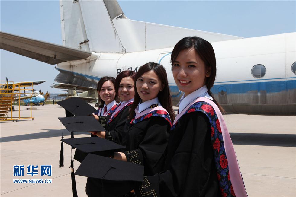 A group of college students from Civil Aviation University of China take photos in front of the large passenger plane, and say goodbye to their colorful college life on June 12, 2014. As college graduation season comes, many graduates are busy having photos taken on campus as a memento. (Pang Jie/Xinhua News Agency)