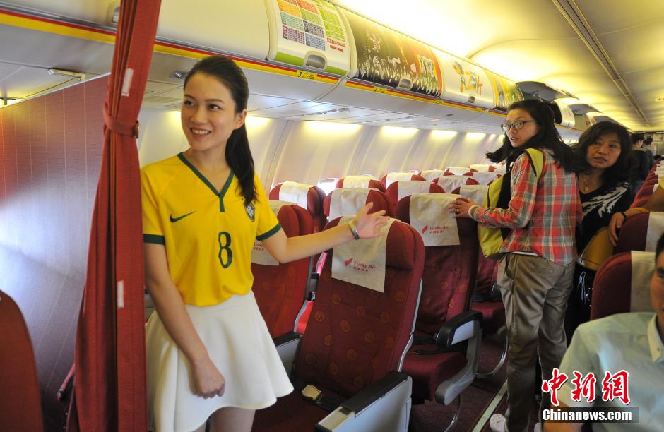 | Stewardesses wearing Brazilian soccer team jerseys provide service to passengers on an airline company based in Yunnan province, China. They will provide "World Cup" featured service on its flights during World Cup 2014. [Photo/Chinanews.com] |