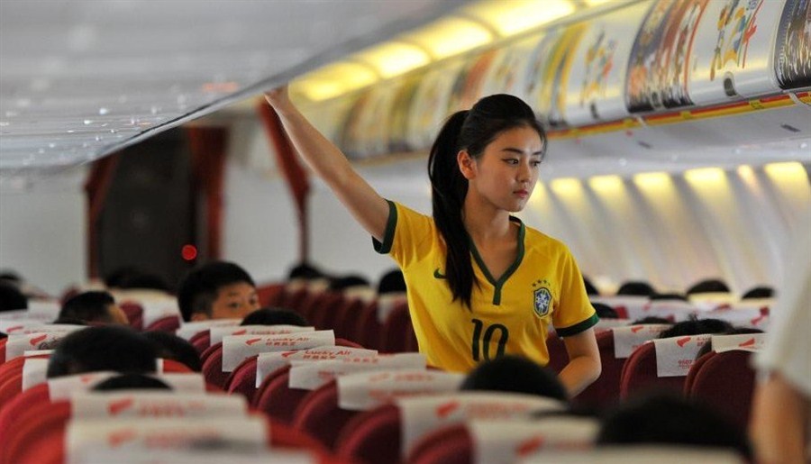 Stewardesses wearing Brazilian soccer team jerseys provide service to passengers on an airline company based in Yunnan province, China. They will provide "World Cup" featured service on its flights during World Cup 2014. [Photo/Chinanews.com]