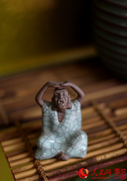 A tea pet is the pet kept by tea lovers and nourished by tea water. It is a kind of artware made by purple sands or clay. When enjoying the tea, the drinker will smear or sprinkle tea water on the tea pets. As time goes by, the tea pets will be moist with soft luster and tea aroma. Tea pets usually take the shape of mythical Chinese beasts, human figures and small animals to express good wishes.(People's Daily Online)