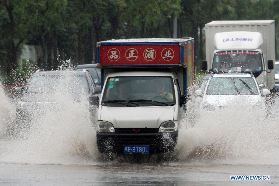 Vehicles drive on a waterlogged street in Jimei District of Xiamen, southeast China's Fujian Province, June 16, 2014. Torrential rain hit Xiamen and four other cities in Fujian after typhoon Hagibis made its landfall in Shantou of the neighbouring Guangdong Province on Sunday night. (Xinhua/Zeng Demeng)