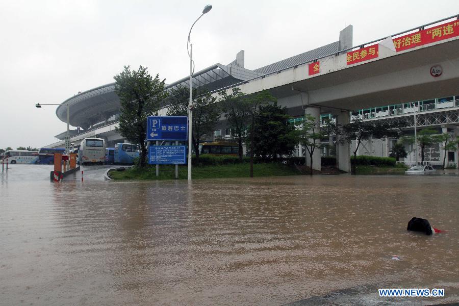 Photo taken on June 16, 2014 shows a waterlogged street in Jimei District of Xiamen, southeast China's Fujian Province. Torrential rain hit Xiamen and four other cities in Fujian after typhoon Hagibis made its landfall in Shantou of the neighbouring Guangdong Province on Sunday night. (Xinhua/Zeng Demeng)