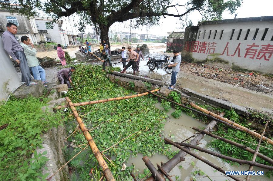 Villagers salvage water lettuce to dredge the waterways in Xiantang Village of Dongqiao Town in Zhao'an County, southeast China's Fujian Province, June 16, 2014. The typhoon Hagibis brought torrential rain to Fujian on Monday. (Xinhua/Lin Shanchuan)
