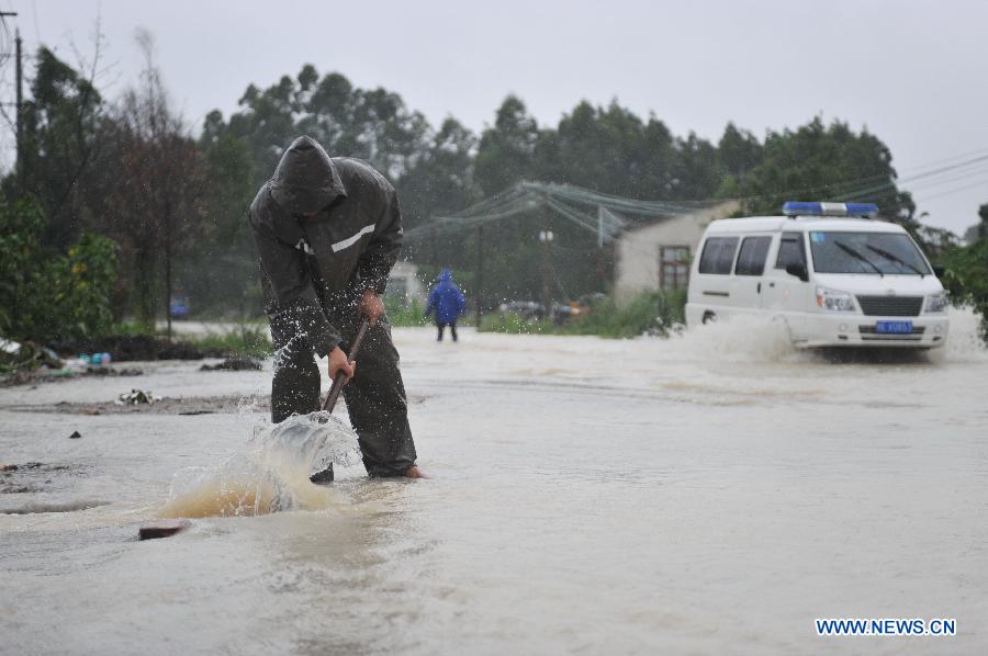 A villager clears water on a road in Dongqiao Town in Zhao'an County, southeast China's Fujian Province, June 16, 2014. The typhoon Hagibis brought torrential rain to Fujian on Monday. (Xinhua/Lin Shanchuan)