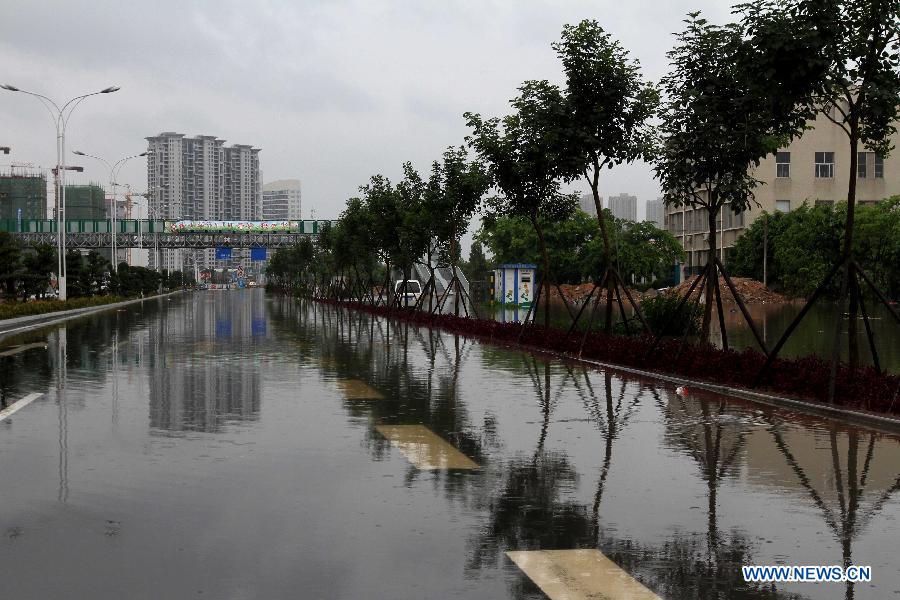 Photo taken on June 16, 2014 shows a waterlogged street in Jimei District of Xiamen, southeast China's Fujian Province. Torrential rain hit Xiamen and four other cities in Fujian after typhoon Hagibis made its landfall in Shantou of the neighbouring Guangdong Province on Sunday night. (Xinhua/Zeng Demeng)