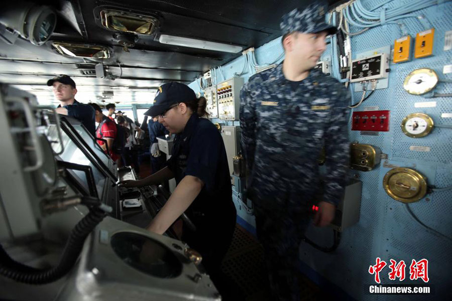 The US Navy's aircraft carrier USS George Washington docks in Hong Kong and welcomes four People's Liberation Army members for a VIP visit on Monday, June 16, 2014. [Photo: Chinanews.com]