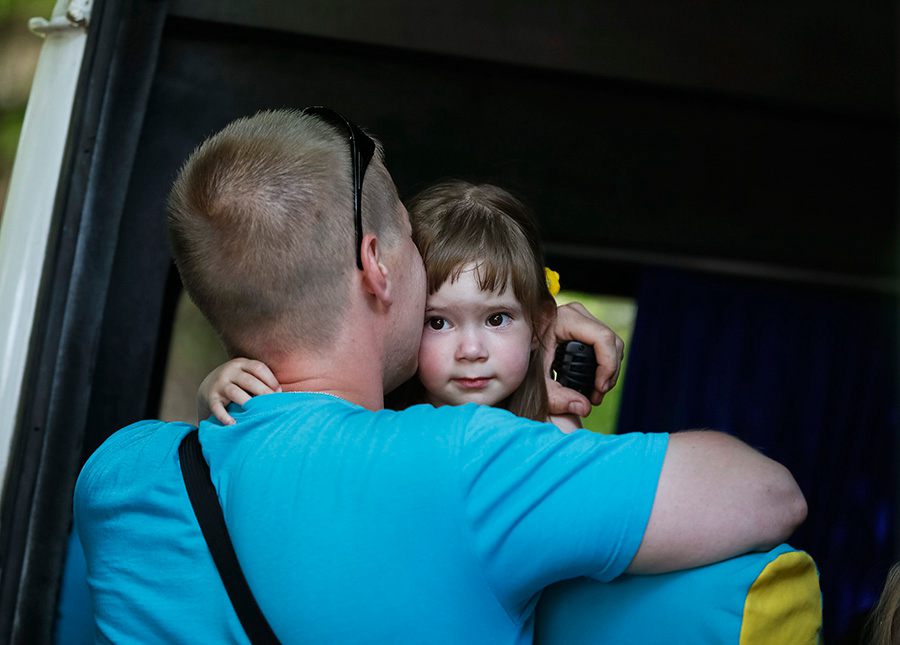 A father holding his daughter boards the bus to leave the war-torn region in Slavyansk, eastern Ukraine on June 7, 2014.