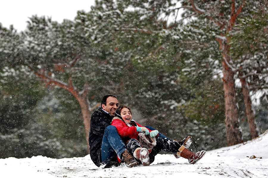A father goes skiing with his daughter in Tehran, Iran on Feb. 4, 2014. (Xinhua/ AP)