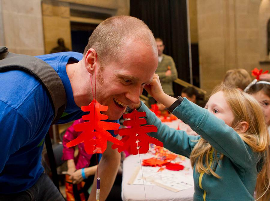 A girl puts her artistic work on her father’s ears in the Royal Ontario Museum, Toronto, Canada on Jan. 25, 2014. (Xinhua/ Zou Zheng)