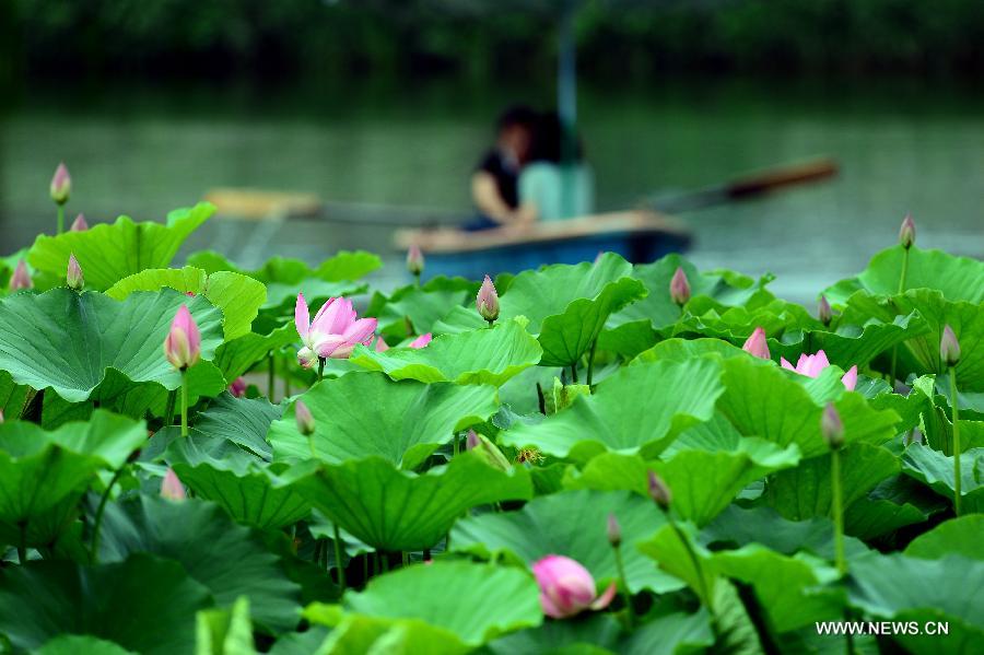 Photo taken on June 18, 2014 shows lotus flowers in blossom at Quancheng Park in Jinan, capital of east China's Shandong Province. (Xinhua/Guo Xulei)