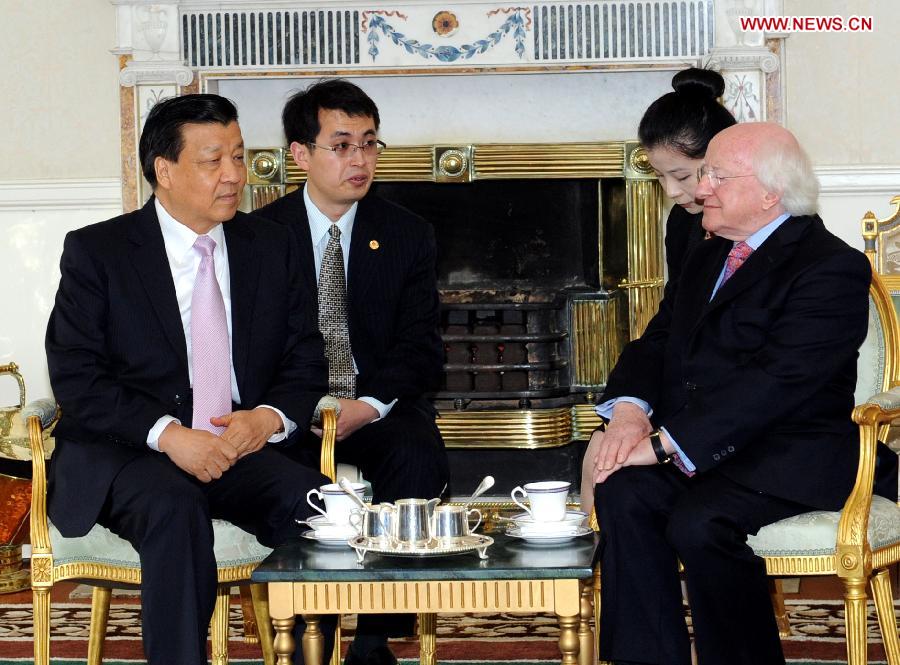 Liu Yunshan (R), a member of the Standing Committee of the Political Bureau of the Central Committee of the Communist Party of China, meets with Irish President Michael D. Higgins in Dublin, capital of Ireland, June 16, 2014. (Xinhua/Rao Aimin)