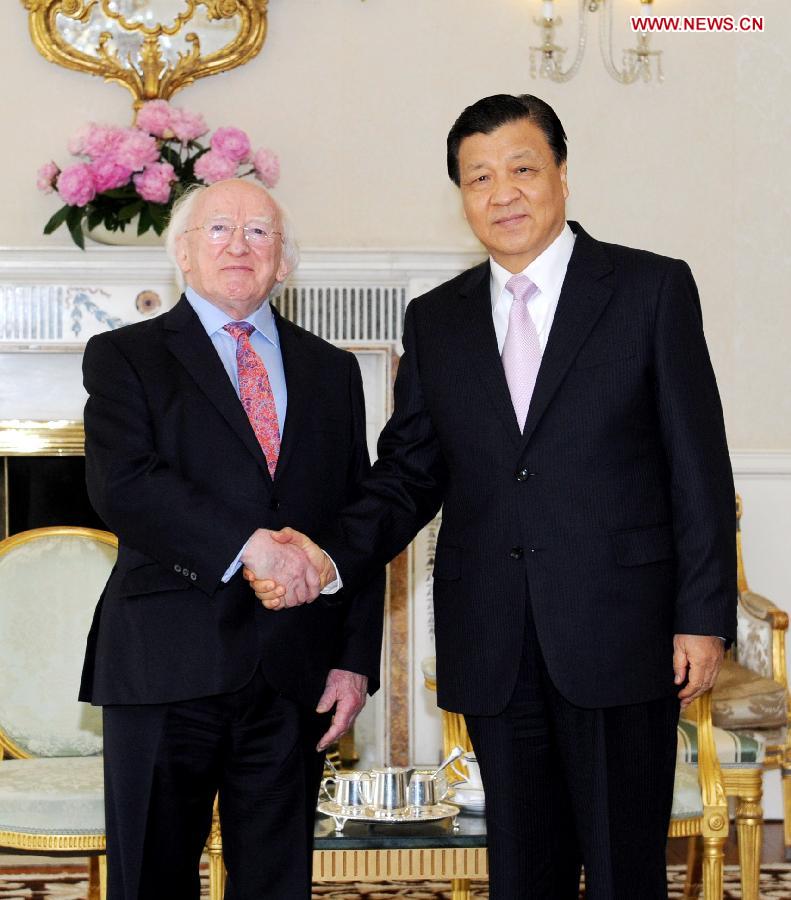 Liu Yunshan (R), a member of the Standing Committee of the Political Bureau of the Central Committee of the Communist Party of China, meets with Irish President Michael D. Higgins in Dublin, capital of Ireland, June 16, 2014. (Xinhua/Rao Aimin)