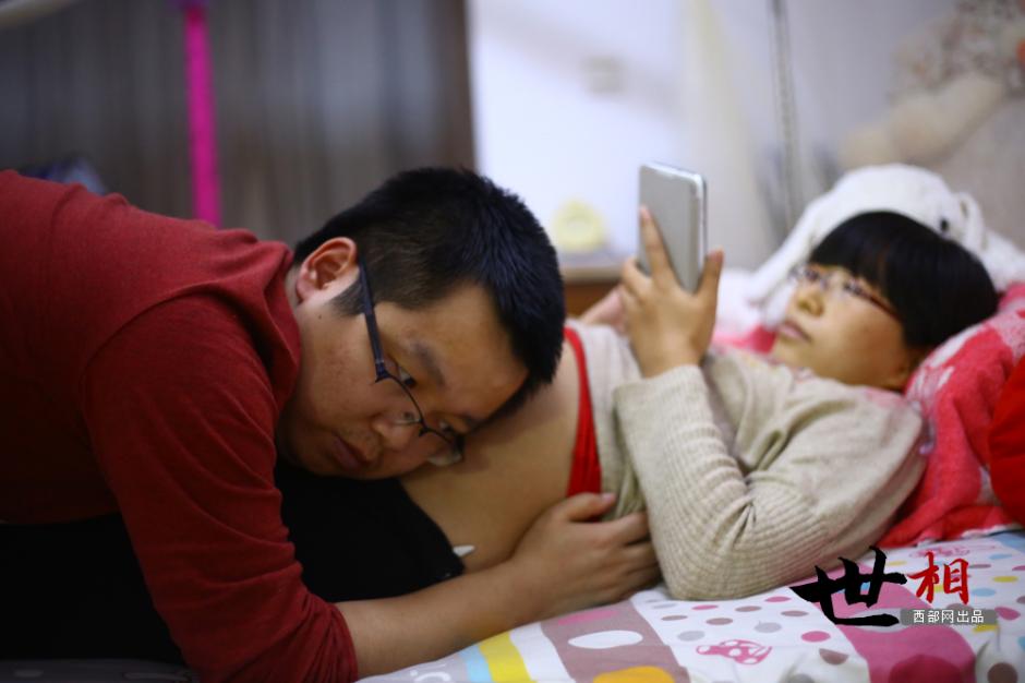 Liu tries to listen to the baby’s heart beating on his wife’s belly. (Photo/cnwest)