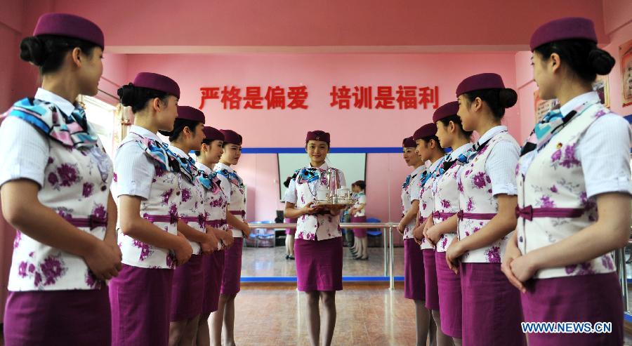 Stewardesses of CHR trains receive training in Chongqing, southwest China, June 18, 2014. As the CHR trains heading from southwest China's Chongqing and Sichuan to eastern China will soon be opened, a total of 169 stewardesses are busy with receiving training. (Xinhua/Cao Ning)