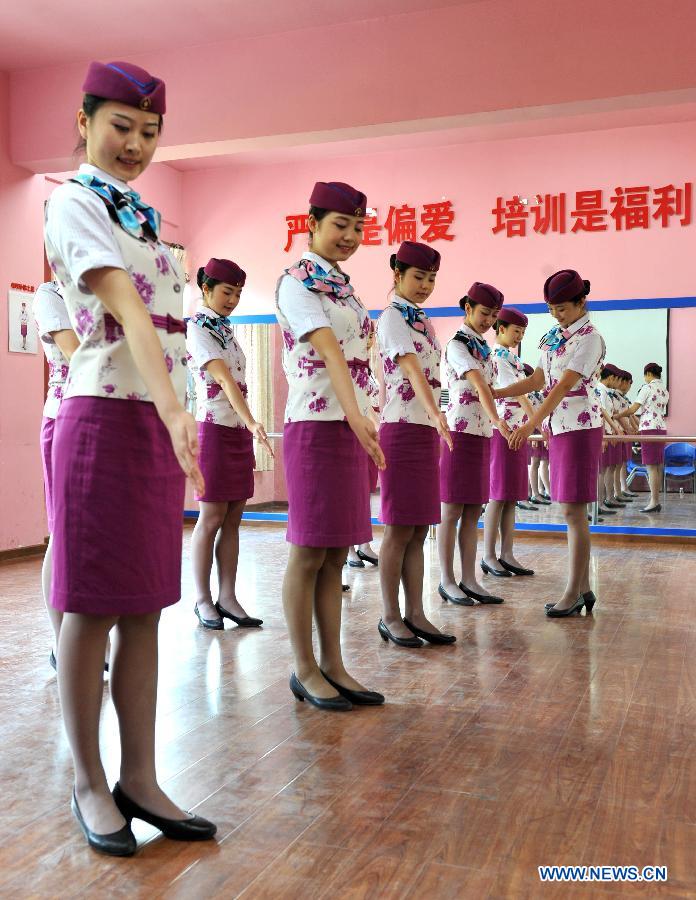Stewardesses of CHR trains receive etiquette training in Chongqing, southwest China, June 18, 2014. As the CHR trains heading from southwest China's Chongqing and Sichuan to eastern China will soon be opened, a total of 169 stewardesses are busy with receiving training. (Xinhua/Cao Ning)