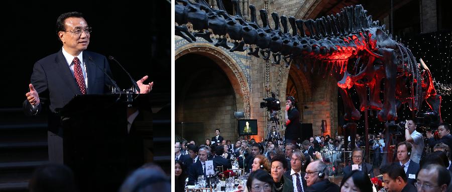 In this photo combination, Chinese Premier Li Keqiang (L) addresses a welcome banquet held by business delegates from both China and Britain at the Natural History Museum in London, capital of Britain, June 17, 2014. (Xinhua/Pang Xinglei)