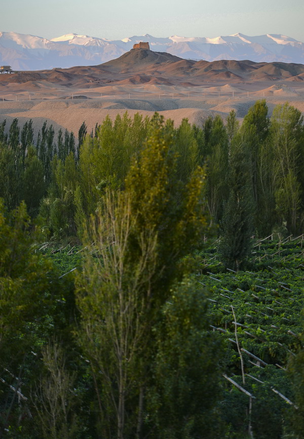 Green plants are planted for desertification prevention in front of Dunhuang relics in Gansu province on Sept. 5, 2013. (Xinhua/ Qi Heng)