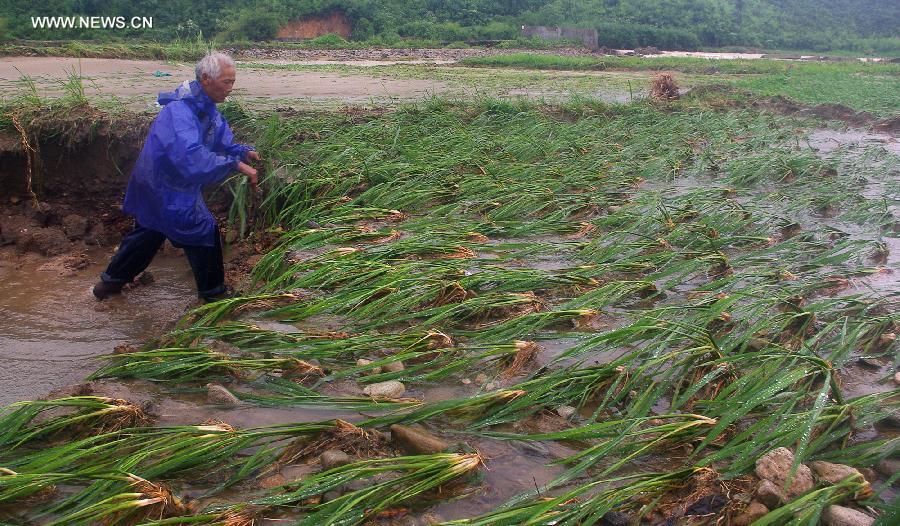 A farmer clears a waterlogged field at Liming Village in Fuzhou City, east China's Jiangxi province, June 20, 2014. More than 2,700 people were evacuated after downpours battered Fuzhou City on Thursday and early Friday. (Xinhua/Wan Limin)