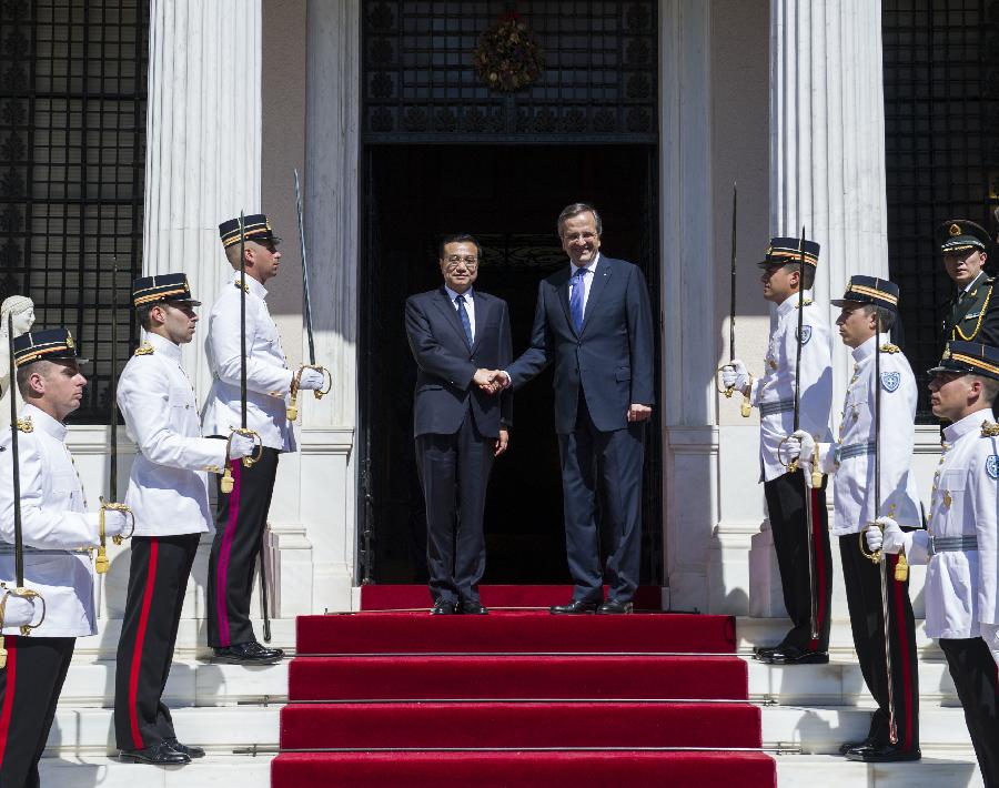 Chinese Premier Li Keqiang (L, center) shakes hands with Greek Prime Minister Antonis Samaras during their talks in Athens, Greece, June 19, 2014. (Xinhua/Wang Ye)