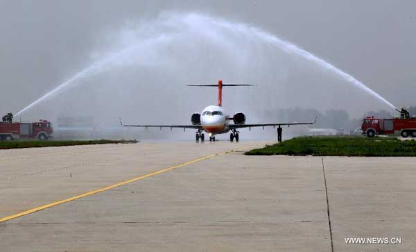 | An ARJ21-700 regional airplane which has accomplished a global test arrives in a test center in Yanliang District of Xi'an, capital of northwest China's Shaanxi Province, April 28, 2014. The ARJ21-700 is a regional airplane made by the Commercial Aircraft Corporation of China (COMAC). It has just passed an icing conditions test in North America in addition to a 30,000-kilometer test mileage worldwide. (Xinhua/Ding Ting) |