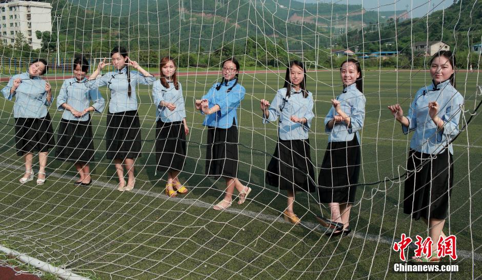 Some graduates in Sichuan University of Arts and Science take group photos themed "Youth never ends" to mark their graduation, June 17, 2014. They wore costumes of the Republic of China period and put on a variety of poses to commemorate the good times spent at the university. (Chinanews.com/Wan Yanming)