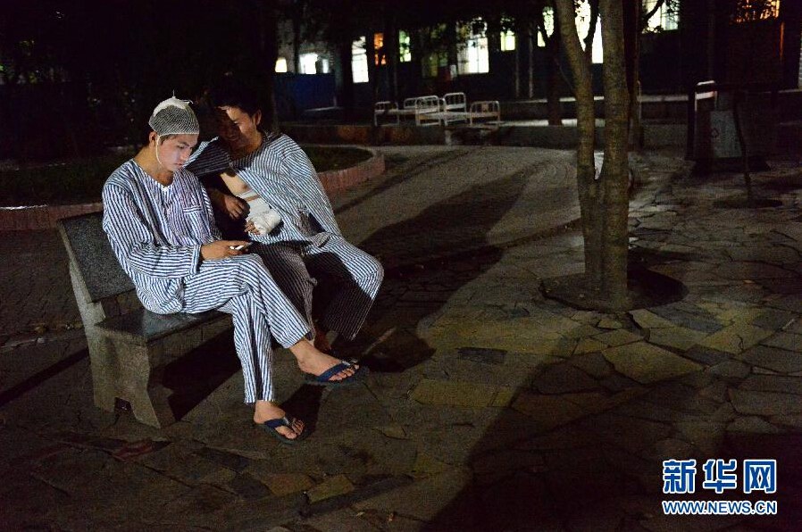 | Liu Yanbing (L) and Yi Zhengyong go out of wards for some fresh air after dinner on June 16, 2014. (Xinhua/ Chen Zixia) |