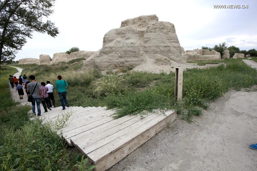 Photo taken on Sept. 11, 2013 shows people visiting the ruins of Yangmacheng, which is located outside the ruins of Beiting protectorate in Jimusar County, northwest China's Xinjiang Uygur Autonomous Region. Beiting, the Protectorate of Tang Dynasty (618-907), was the most important city on the ancient Silk Road. The famous ancient Silk Road, which served as a corridor for trade and cultural exchanges between Asia and Europe dating back to 2,000 years ago, was inscribed on the World Heritage list at Doha, capital of Qatar on June 22, 2014. Jointly submitted by China, Kazakhstan and Kyrgyzstan, the application for adding part of the millennium-old trade route to the UNESCO list was approved by the World Heritage Committee which convened its 38th session in Doha. (Xinhua)