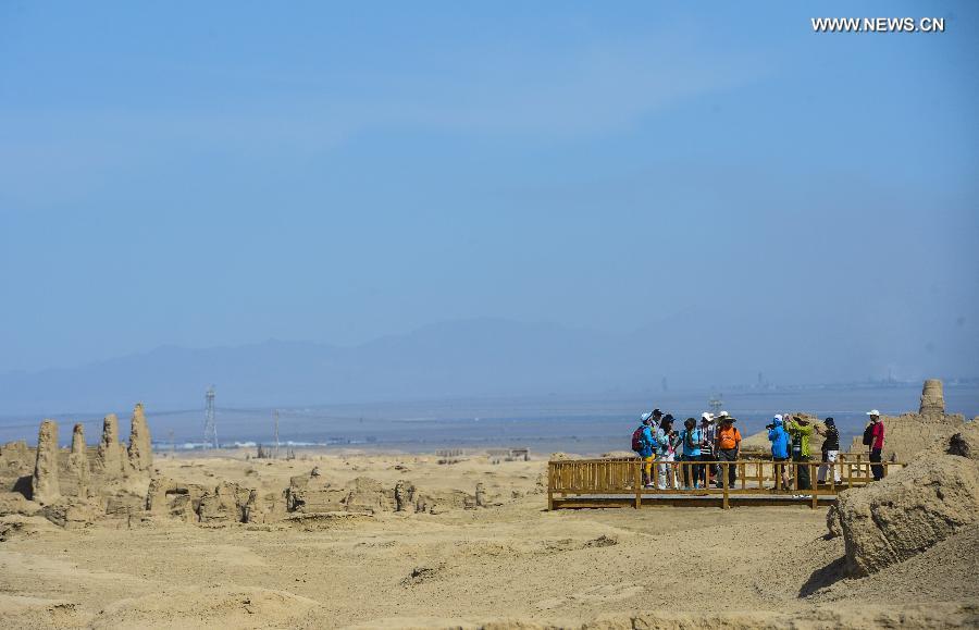 Photo taken on June 11, 2014 shows tourists visiting the Jiaohe Relic in Turpan, northwest China's Xinjiang Uygur Autonomous Region. The famous ancient Silk Road, which served as a corridor for trade and cultural exchanges between Asia and Europe dating back to 2,000 years ago, was inscribed on the World Heritage list at Doha, capital of Qatar on June 22, 2014. Jointly submitted by China, Kazakhstan and Kyrgyzstan, the application for adding part of the millennium-old trade route to the UNESCO list was approved by the World Heritage Committee which convened its 38th session in Doha. (Xinhua)