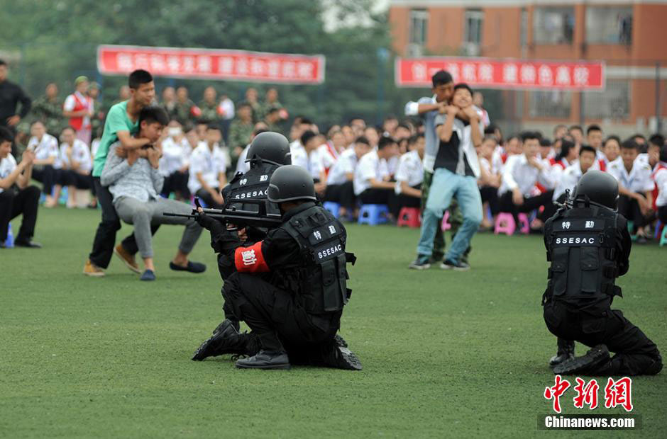 China's first college anti-terrorism and riot squad conducts a drill on the campus of Chengdu East Star Airlines Travel College on June 20. The police officers of the Chengdu Municipal Public Security Bureau will give the squad members two-month-long rigorous training which include physical training and tactical drills. (Chinanews.com/Zhong Xin)