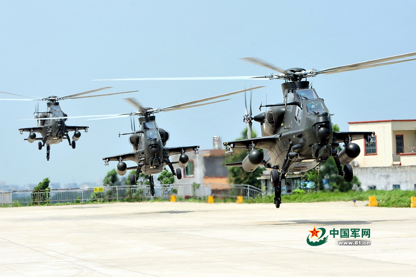 A flight formation of attack helicopters which are loaded with air-to air missiles cruise during the flight training in Nanjing on June 19, 2014. (Photo/ Xiao Qingming)