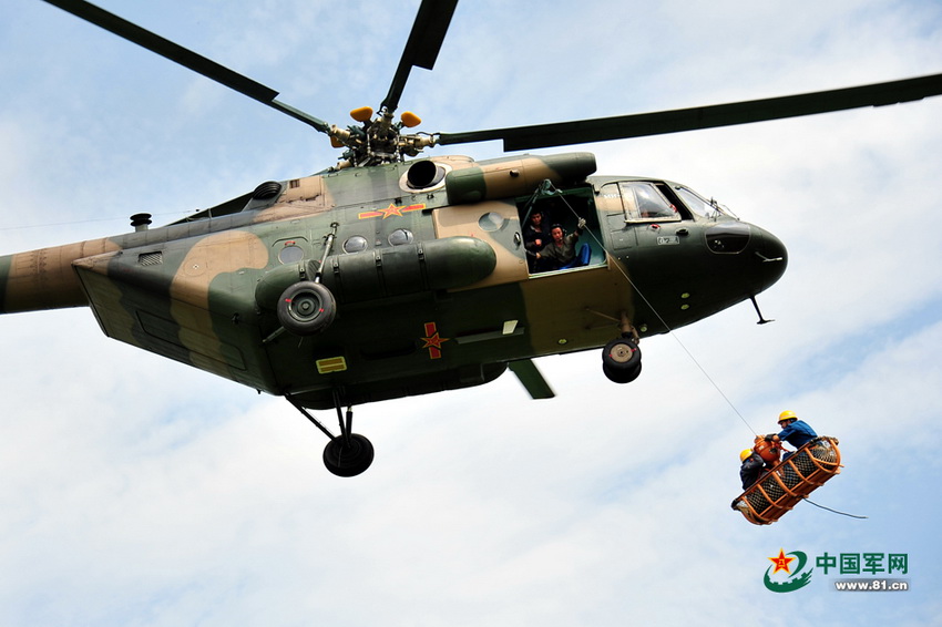 A flight formation of attack helicopters which are loaded with air-to air missiles cruise during the flight training in Nanjing on June 19, 2014. (Photo/ Xiao Qingming)