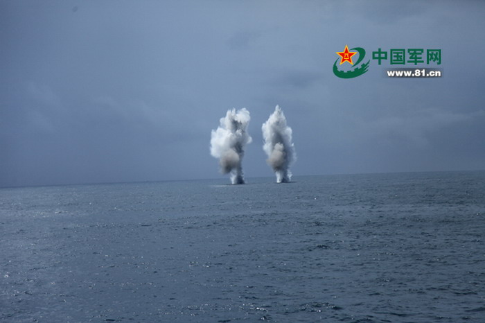 A fleet of frigates conducts combat drills in East China Sea on June 25, 2014. Soldiers fired rocket depth-charge missiles during the drills. (Photo/ Zhou Daoxian)