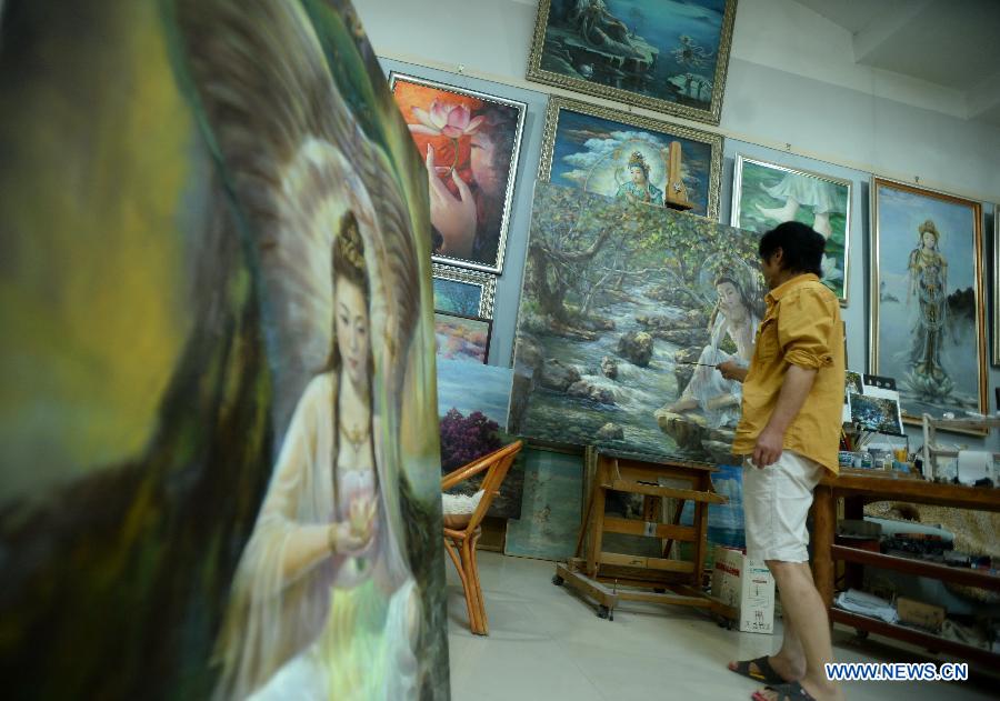 A painter draws a painting at a studio in Yuequan Town, Dunhuang City, northwest China's Gansu Province, June 27, 2014. Attracted by the art form of Mogaoku Grottos mural, more and more young artists gathered in Dunhuang to learn for mural creation and set up their studios. (Xinhua/Nie Jianjiang)
