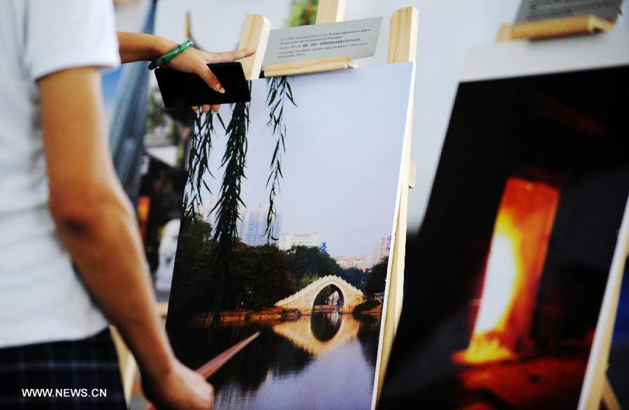 Photo taken by Russian Prime Minister Dmitry Medvedev are shown on display at the China-Russia Expo (CR Expo) in Harbin, capital of northeast China's Heilongjiang Province, June 30, 2014. The expo, which kicked off on June 30, will last until July 4. (Xinhua/Wang Jianwei)