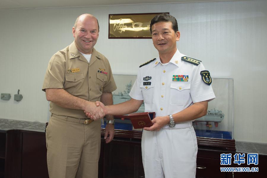 Chinese RIMPAC drill director Zhao Xiaogang (right) hands a souvenir to Vice Adm. Kenneth Floyd aboard PLA Navy missile destroyer Haikou in Hawaii on June 28, 2014. (Photo/Xinhua)