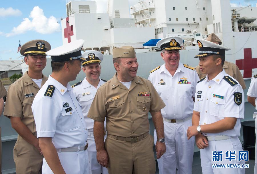 U.S. Vice Adm. Kenneth Floyd (3rd right), commander of the U.S. Third Fleet, talks with PLA Navy soldiers aboard Chinese missile destroyer Haikou in Hawaii on June 28, 2014. (Photo/Xinhua)