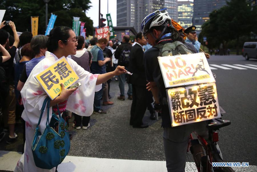 People attend a rally to protest against the attempt to exercise the rights to collective self-defense in front of the Prime Minister's official residence in Tokyo, Japan, June 30, 2014. Thousands of Japanese people gathered here Monday, protesting against Japanese Prime Minister Shinzo Abe's attempt to allow Japan's Self-Defense Forces (SDF) to exercise the rights to collective self-defense. The Japanese government sought to get a green light from the Cabinet on July 1 for a resolution that will allow Japan to exercise collective self-defense rights through reinterpreting the country's pacifist Constitution. (Xinhua/Liu Tian)