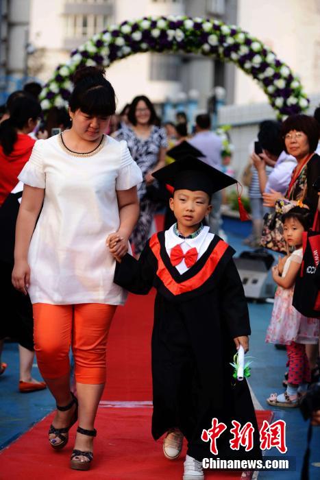 Children accompanied by their parents walk the red carpet at the graduation ceremony of a kindergarten in Qingdao in east China's Shandong province on June 28, 2014. The children signed their names on the board, like the shining stars. (Photo/CNS)