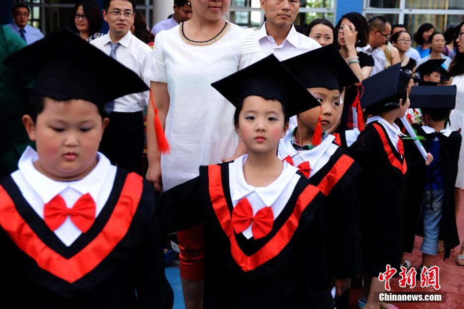 Children accompanied by their parents walk the red carpet at the graduation ceremony of a kindergarten in Qingdao in east China's Shandong province on June 28, 2014. The children signed their names on the board, like the shining stars. (Photo/CNS)
