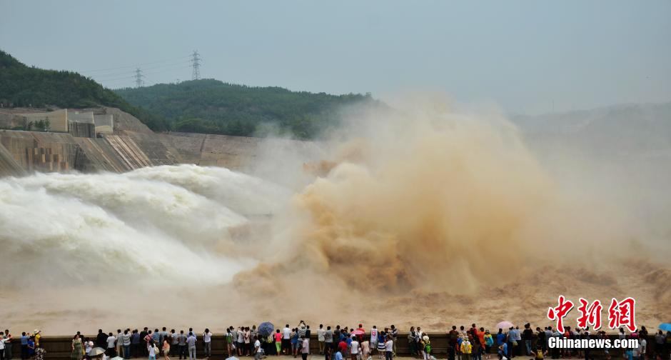 The sediment regulation begins at Xiaolangdi of Yellow River on June 30, 2014. The breathtaking landscape of rolling waves and towering waterfalls attracted visitors across the country. (Photo/CNS)