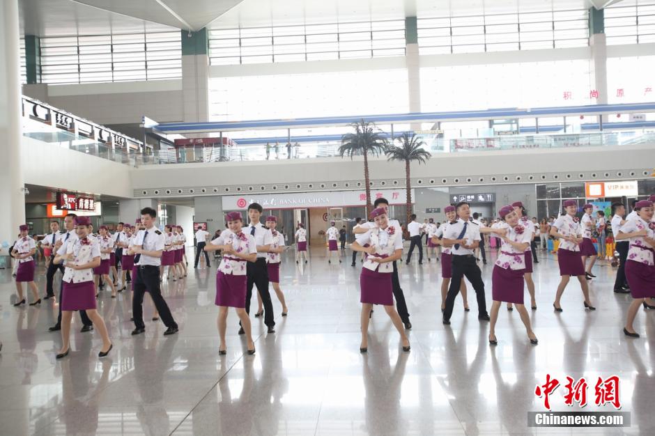 More than one hundred staff members of the Chengdu East Railway Station stage a flash mob dance to celebrate the operation of high-speed trains from Chengdu to Shanghai, Nanjing, and Wuhan in Chengdu, capital of southwest China's Sichuan province on July 1, 2014. (Chinanews.com/Zhu Linlin)