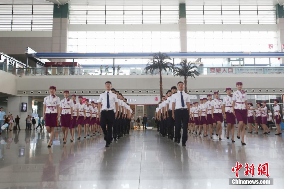 More than one hundred staff members of the Chengdu East Railway Station stage a flash mob dance to celebrate the operation of high-speed trains from Chengdu to Shanghai, Nanjing, and Wuhan in Chengdu, capital of southwest China's Sichuan province on July 1, 2014. (Chinanews.com/Zhu Linlin)